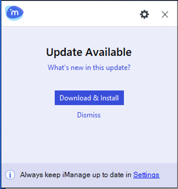 iManage Auto Updates is configured to automatically download and install updates as soon as they are available. If you want to control the installation of updates manually, select Settings to disable automatic download and install of iManage Work Desktop for Windows. For more information, refer to Enabling automatic download and installation.