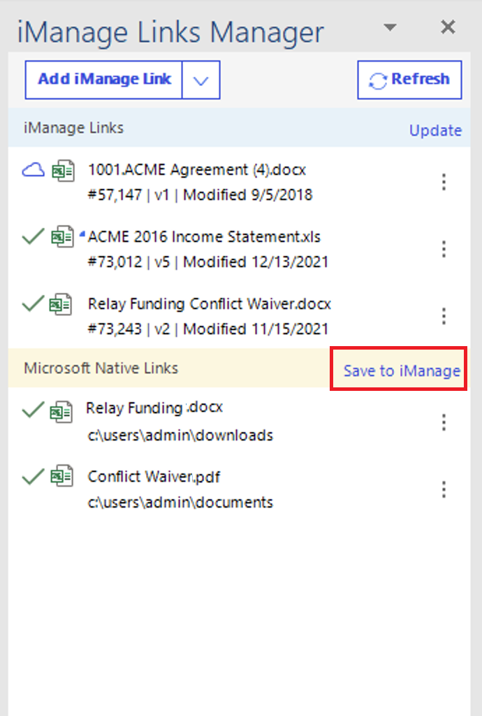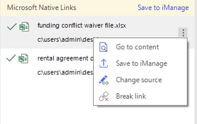 Figure: Working with native links(Optional) Select Save to iManage to save all the documents to iManage Work. Alternatively, if you want to save each document individually, select next to the document you want to save and then save Save to iManage. The iManage Save As dialog box appears. Browse to the desired location and then select Save. The document is saved to iManage Work.