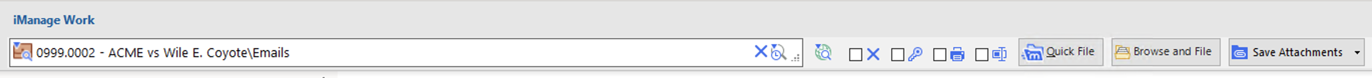 File emails quickly by typing in the search box to find workspaces and using the Quick File option. For more information, see Quick filing using workspace search in iManage Work toolbar.