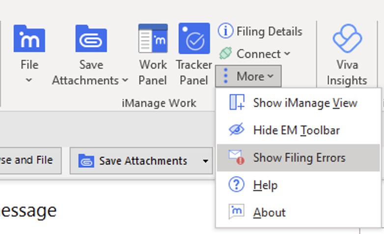 To access Show Filing Errors, browse to iManage tab in Microsoft Outlook and then select More. The Show Filing Errors option is available in the drop-down menu as displayed in the following figure.