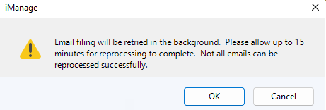 UseClientSideFilingandClientSideSendandFileconfiguration settings are enabled in the imEMM.config file.The Retry Filing feature may not file all emails that weren't previously filed due to errors. For example, if the filing failed for certain emails because you don't have access to the filing location then the filing continues to fail until you get the necessary access.