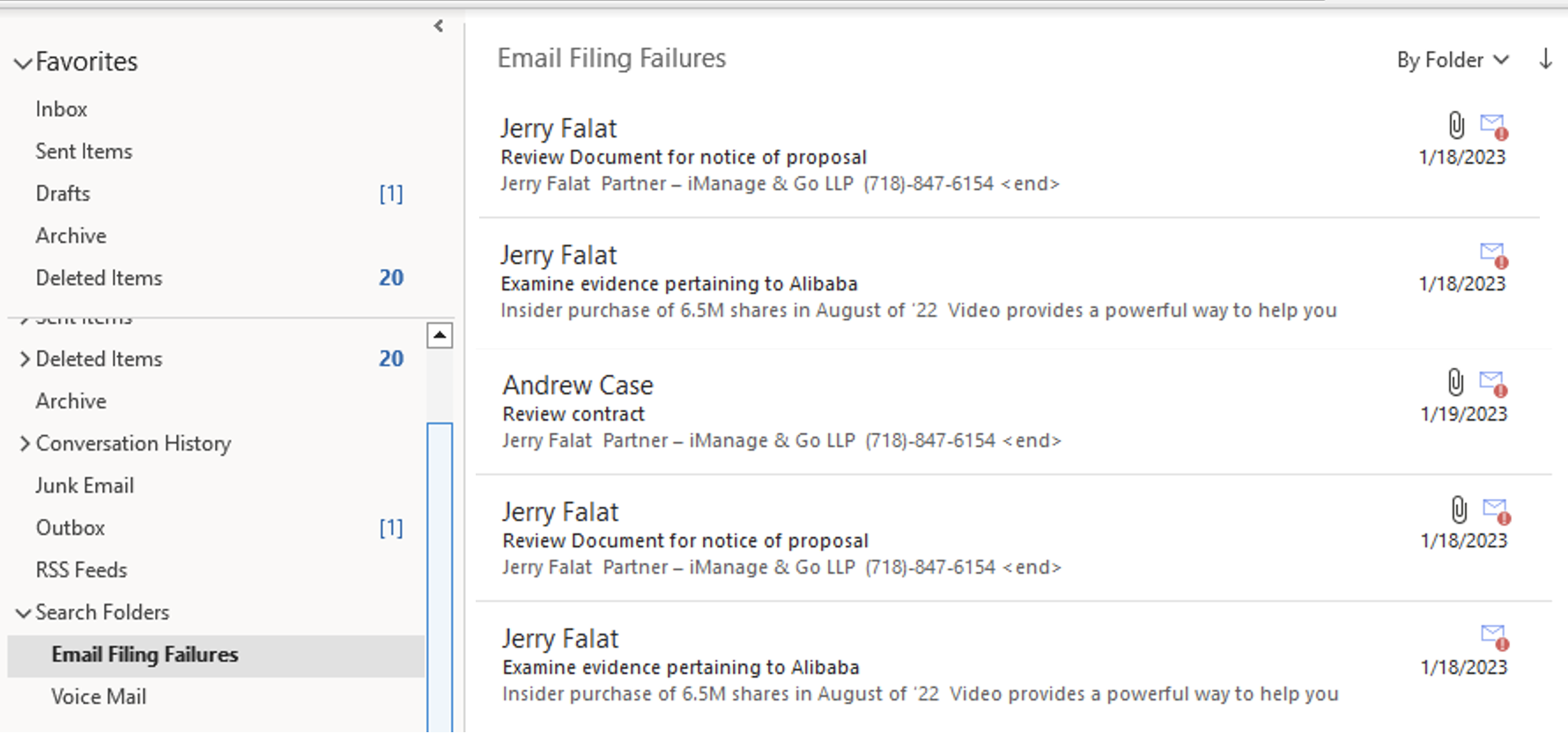 When you select Show Filing Errors, all the emails that aren't filed due to various errors are displayed as shown in the following figure. These emails are available in the Email Filing Failures search folder. The Email Filing Failures search folder is available under Search folders in the Microsoft Outlook tree.