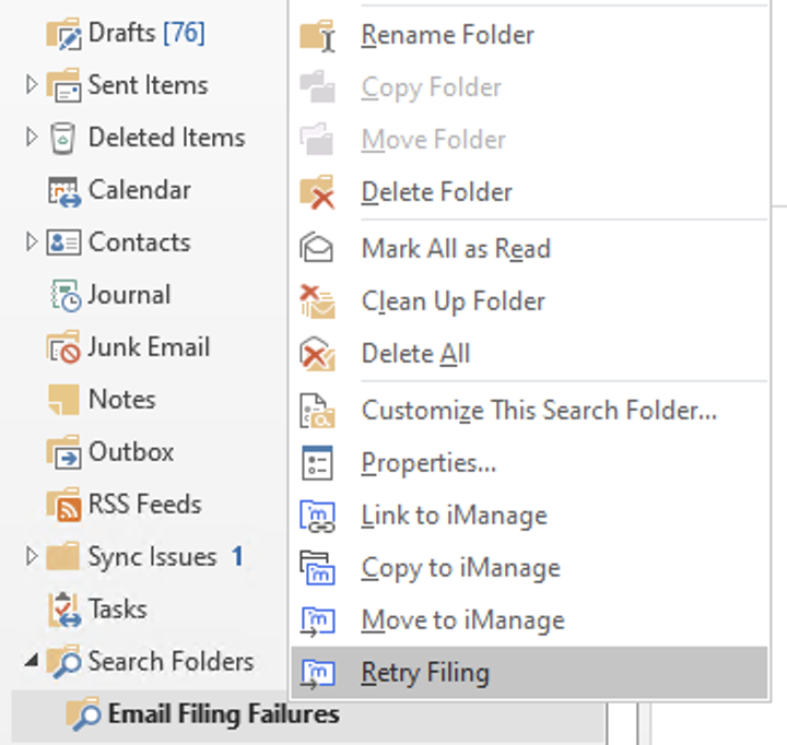 Right-click the Email Filing Failures folder and then select Retry Filing as shown in the following figure: