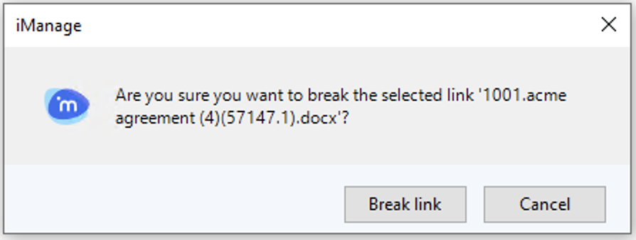 In the iManage Links Manager panel, select next to the source document that you want to remove from the container document.