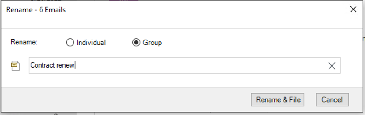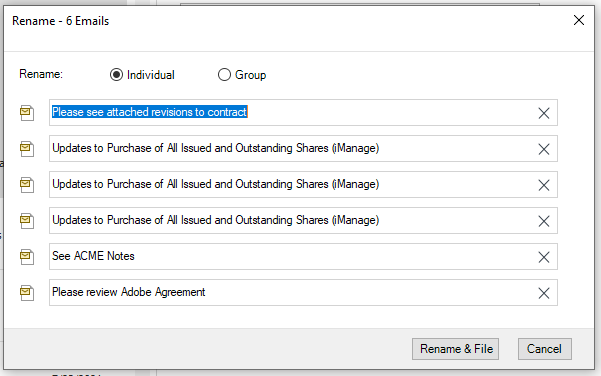 Similarly, when you select multiple emails to be filed, the Rename dialog gives you the option to individually rename the subject of all the emails that you have selected for filing as shown in the following figure.