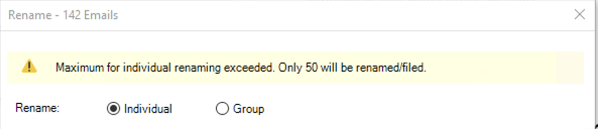 For example, if the RenameEmailsMaximum is set to 50 and you select 142 emails for renaming their subject, the Rename dialog displays a warning message as shown in the following figure. You can rename the subject of and file only the first 50 emails. The remaining 92 emails aren't filed.