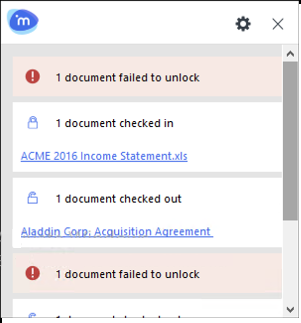 The Agent acts as an interface for document activities that require interaction between the iManage Work Desktop for Windows client and iManage Work Web Server, or iManage and non-integrated applications. It pops up in the corner of the screen to show the notifications/errors related to such activities.