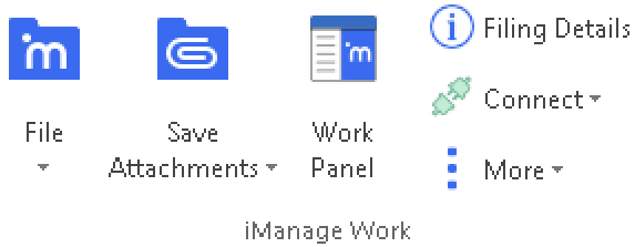 The iManage Work group is located in the upper-right corner of the Home tab in the Microsoft Outlook ribbon. It has the following commands: