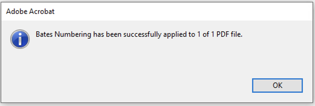 Make necessary changes and select OK. After the bates number are added, a confirmation dialog box appears.