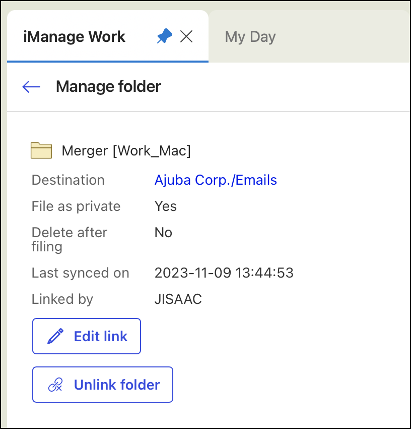 If you had previously linked folders using iManage Work Desktop for Windows, this folder linking does not work on Mac. You need to relink these folders using iManage Work Desktop for Mac.
