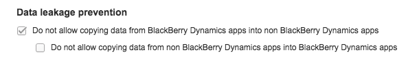 Using the BlackBerry Dynamics profile in BlackBerry UEM, you must enable data transfer from non-managed to managed apps, and disable data transfer from managed to non-managed apps, as shown in the following figure: