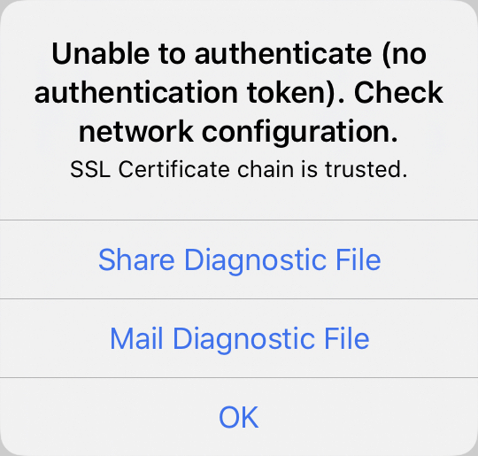 For any authentication issues, iManage Work Mobility produces a Share Diagnostic File alert. In the alert, the user can choose to share or mail the report.