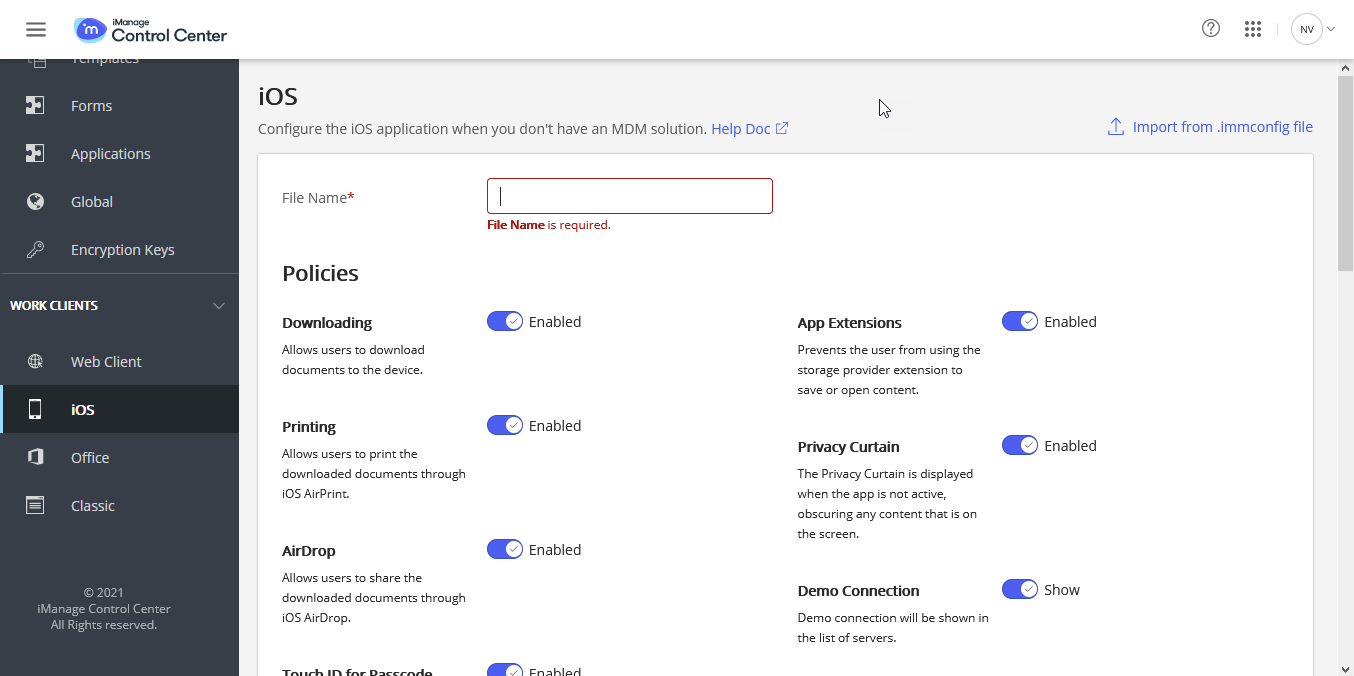 Figure: iOS configuration page in iManage Control CenterSee the information provided in the iManage Control Center online help to complete these steps.