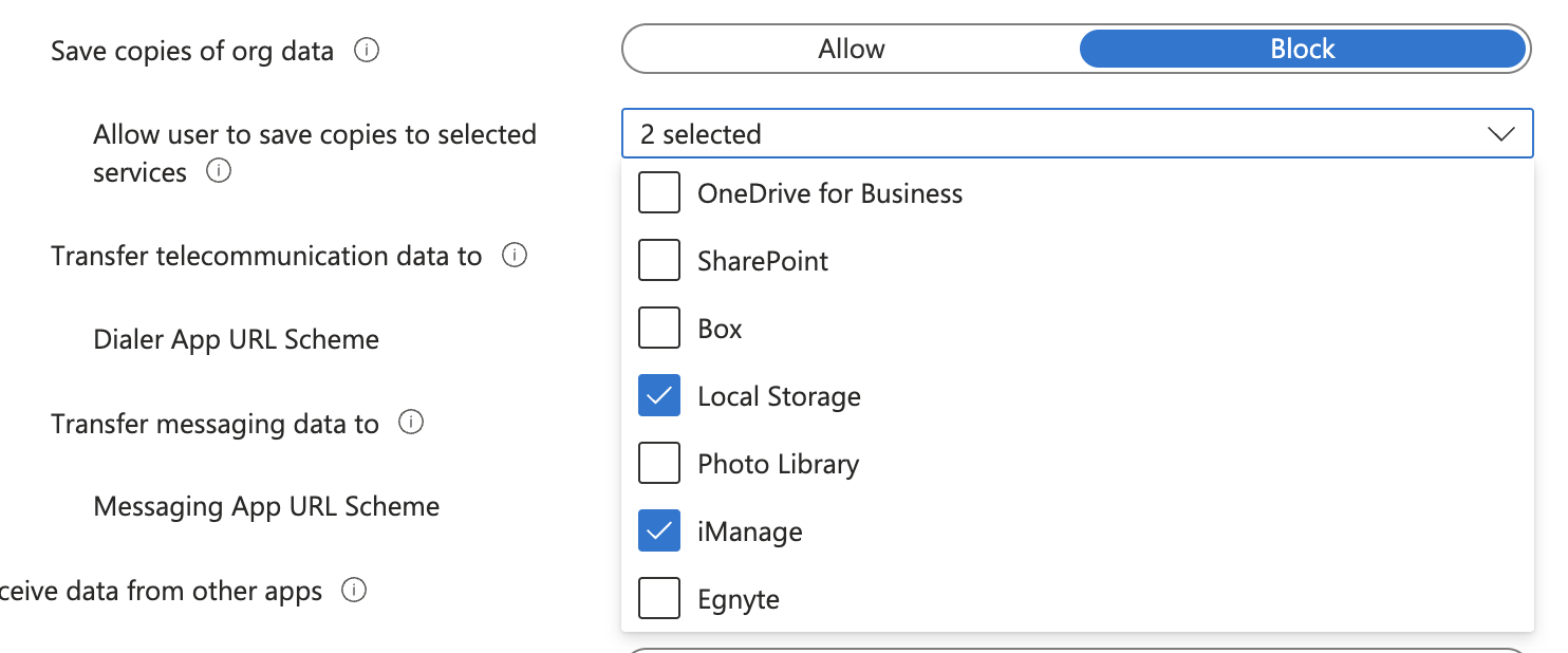 Browse to Save copies of org data and then set it to Block. Under Allow user to save copies to selected services, select iManage. This ensures that iManage service location an Intune protect spot on the device and the ensures that data is protected.