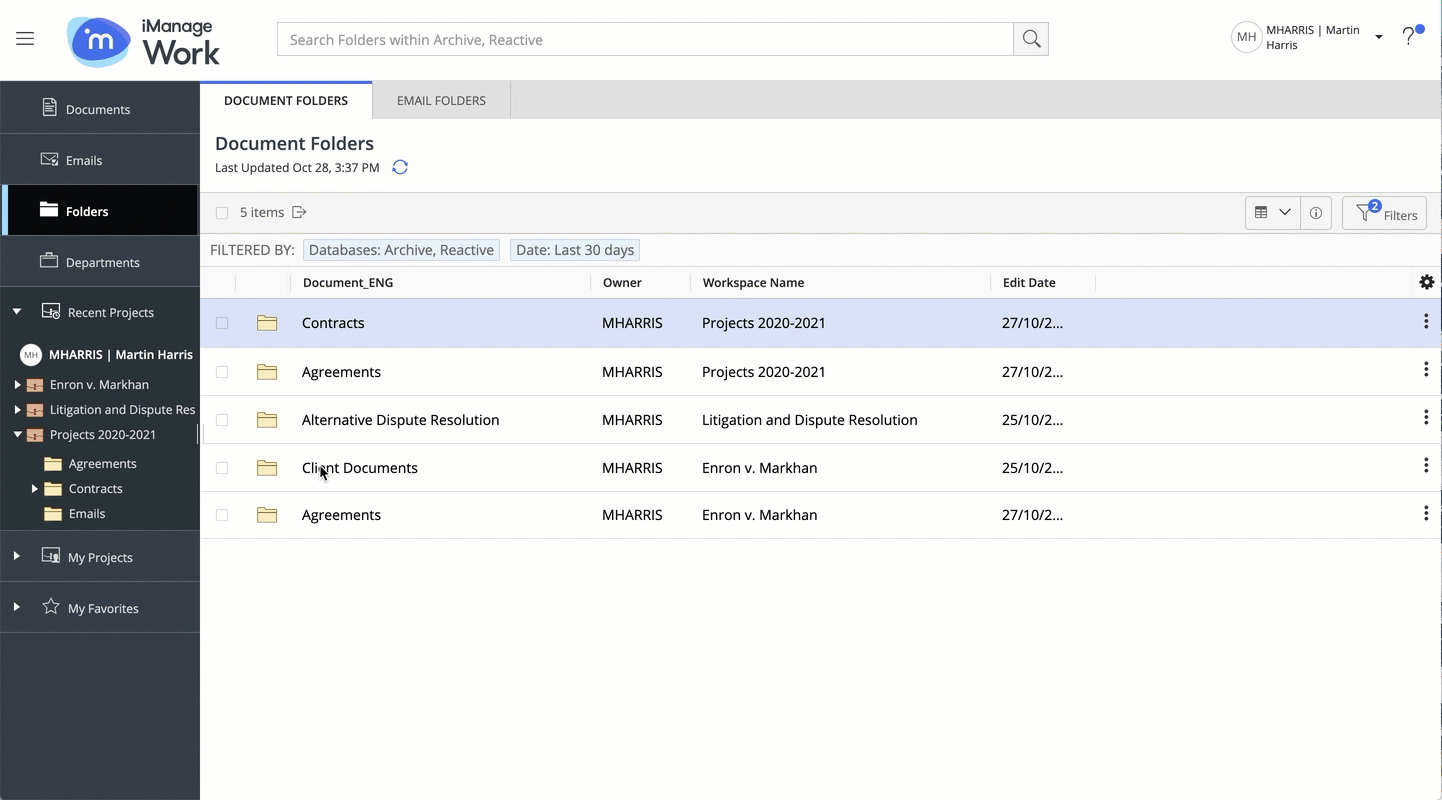 If you select multiple document folders, the option is available on the toolbar.