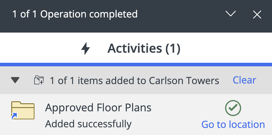 Select Go to location in the progress dialog box to navigate to the newly created document folder shortcut in the workspace/tab.