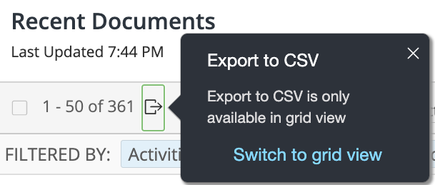 You can export the metadata of one or more items in the grid view to a .csv file using the Export option in the toolbar. The metadata exported are basically the column values that you have configured in the Grid view settings.