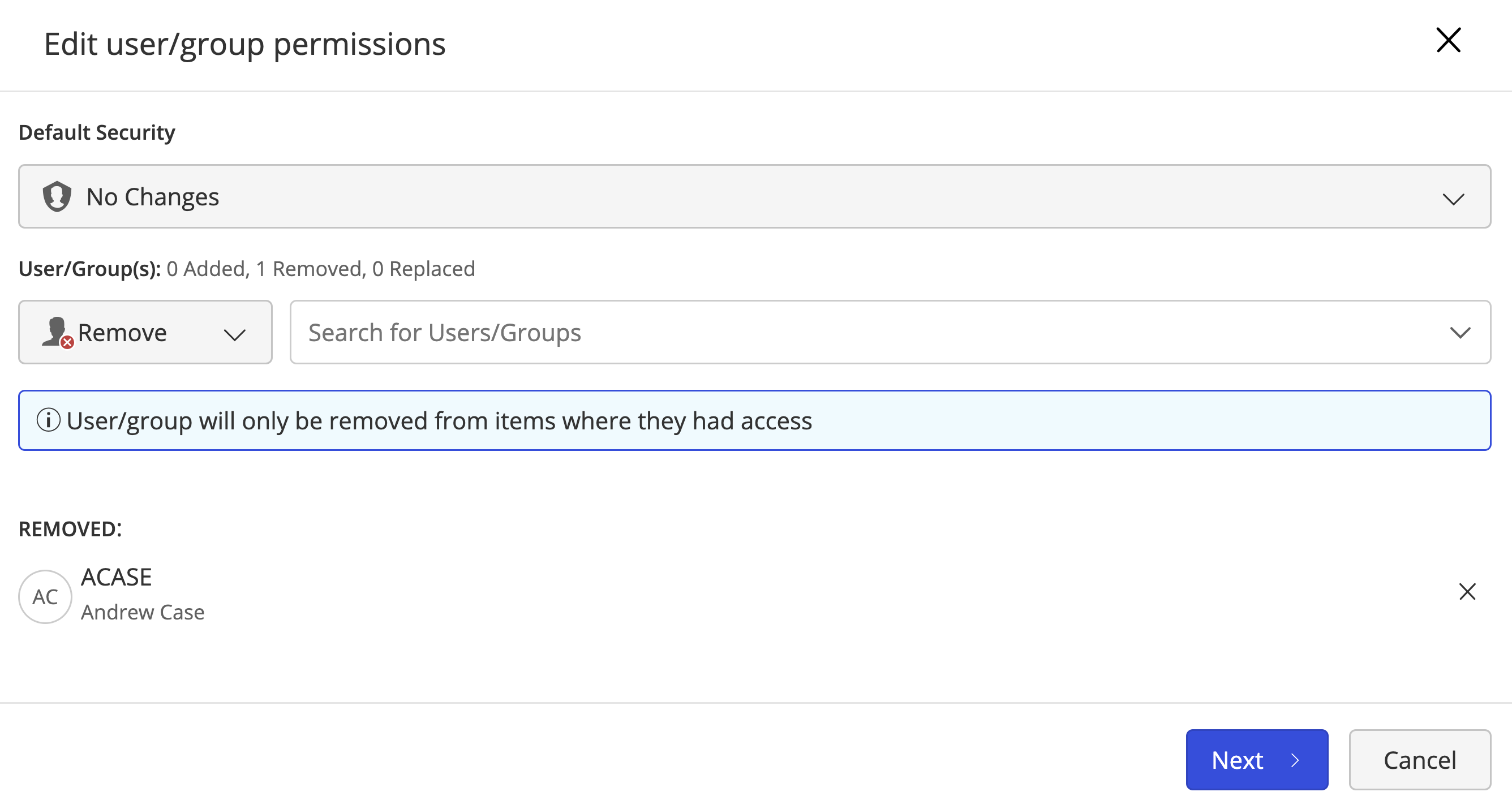 To download a report containing the details of each item updated as part of the Edit user/group permissions operation in a .csv format, select Download Report. Permission changes requested as part of the Edit user/group permissions operation are also listed in the beginning of the report. You can also view the Properties of items updated by selecting the document number in the Report: Edit user/group permissions dialog box.