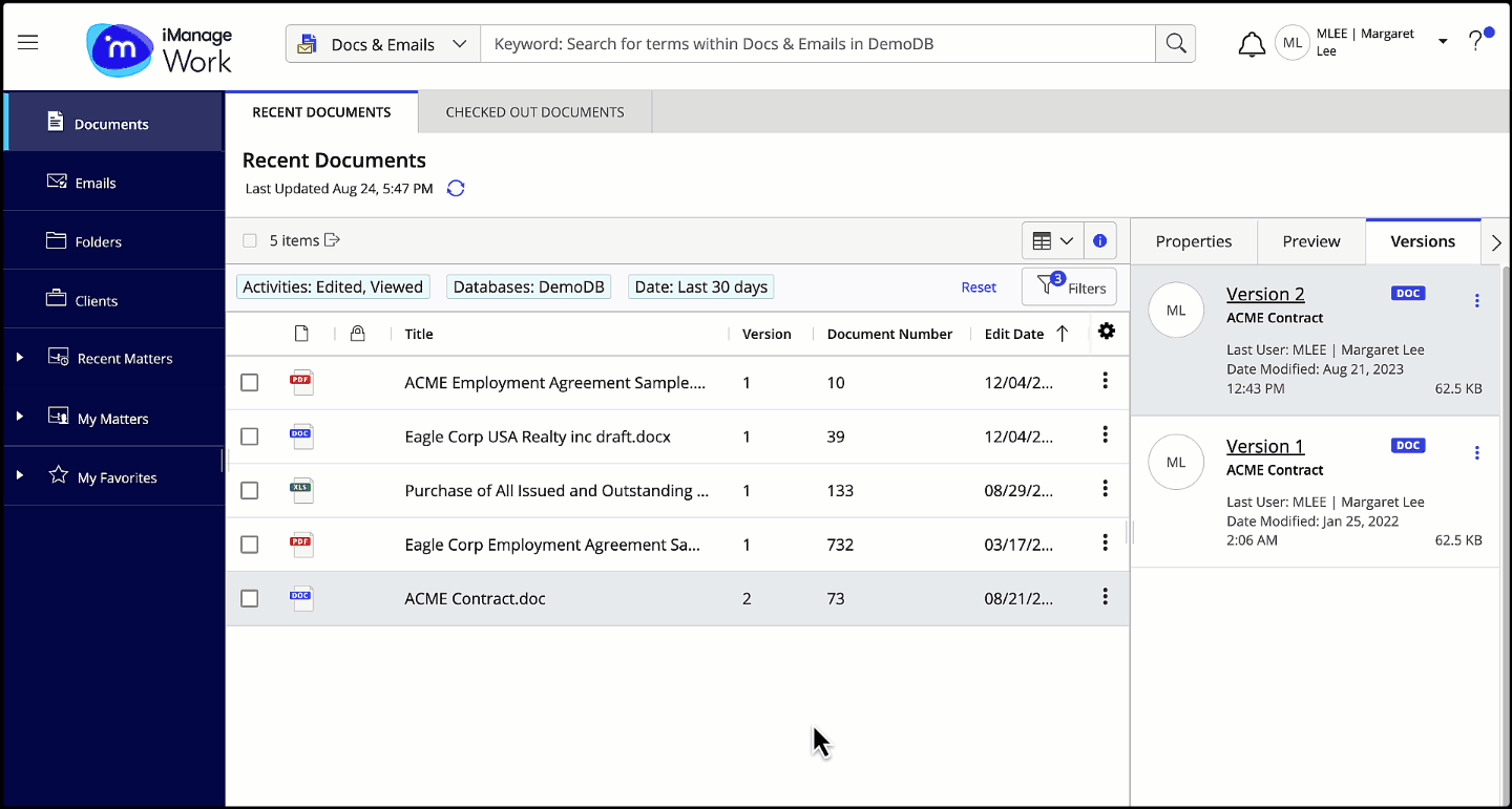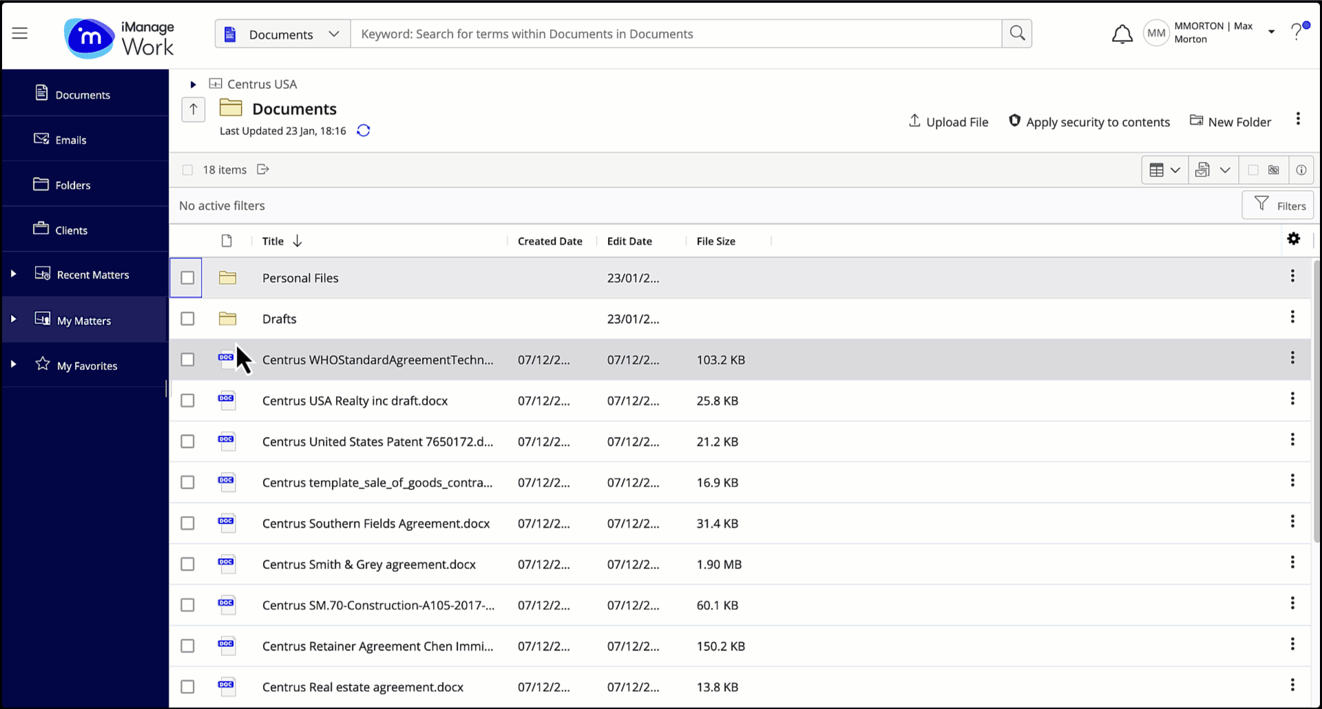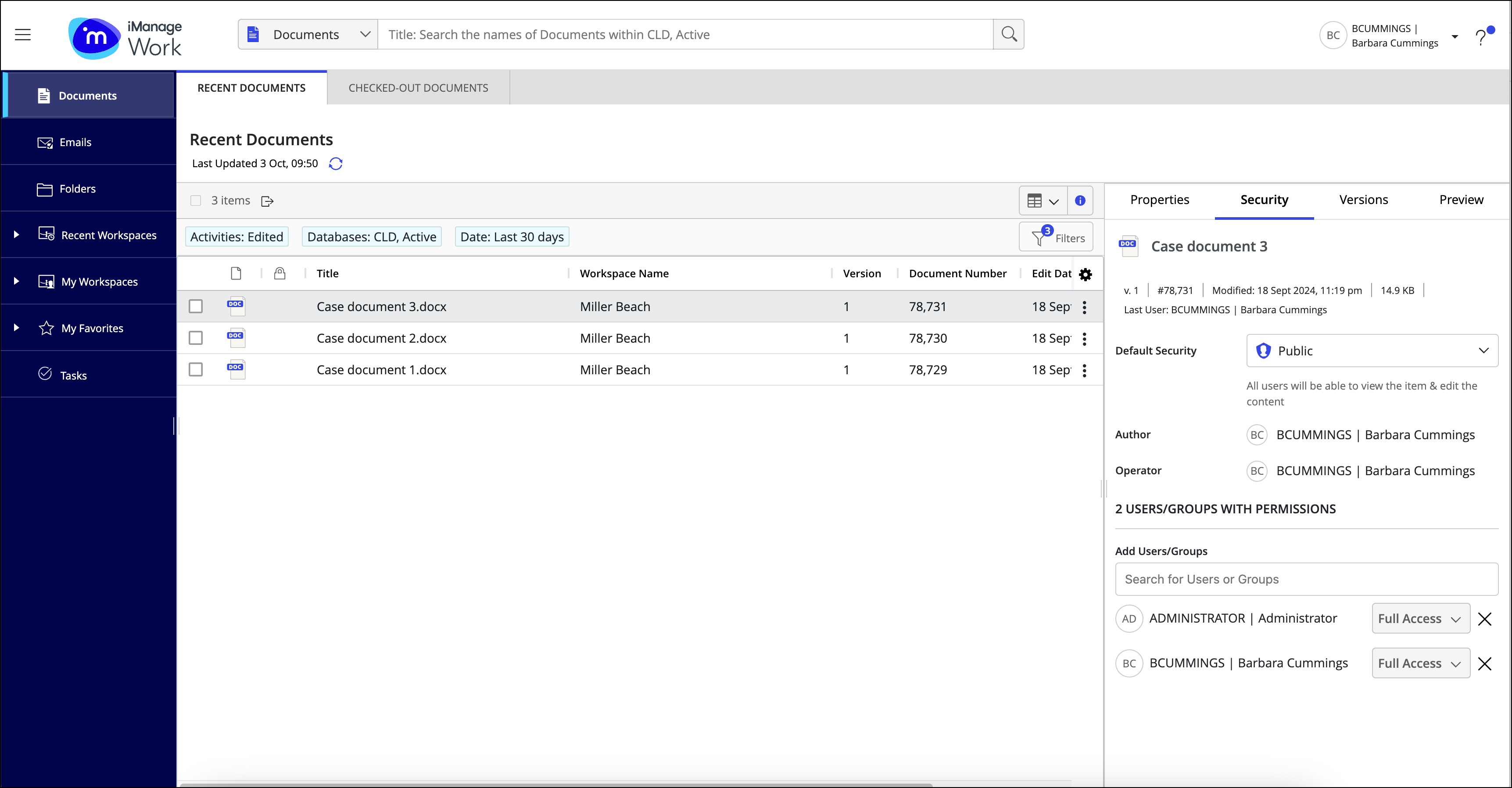 This update introduces a dedicated security panel in iManage Work that helps you perform all security-related actions quickly and also easily see permissions as you scroll through files.