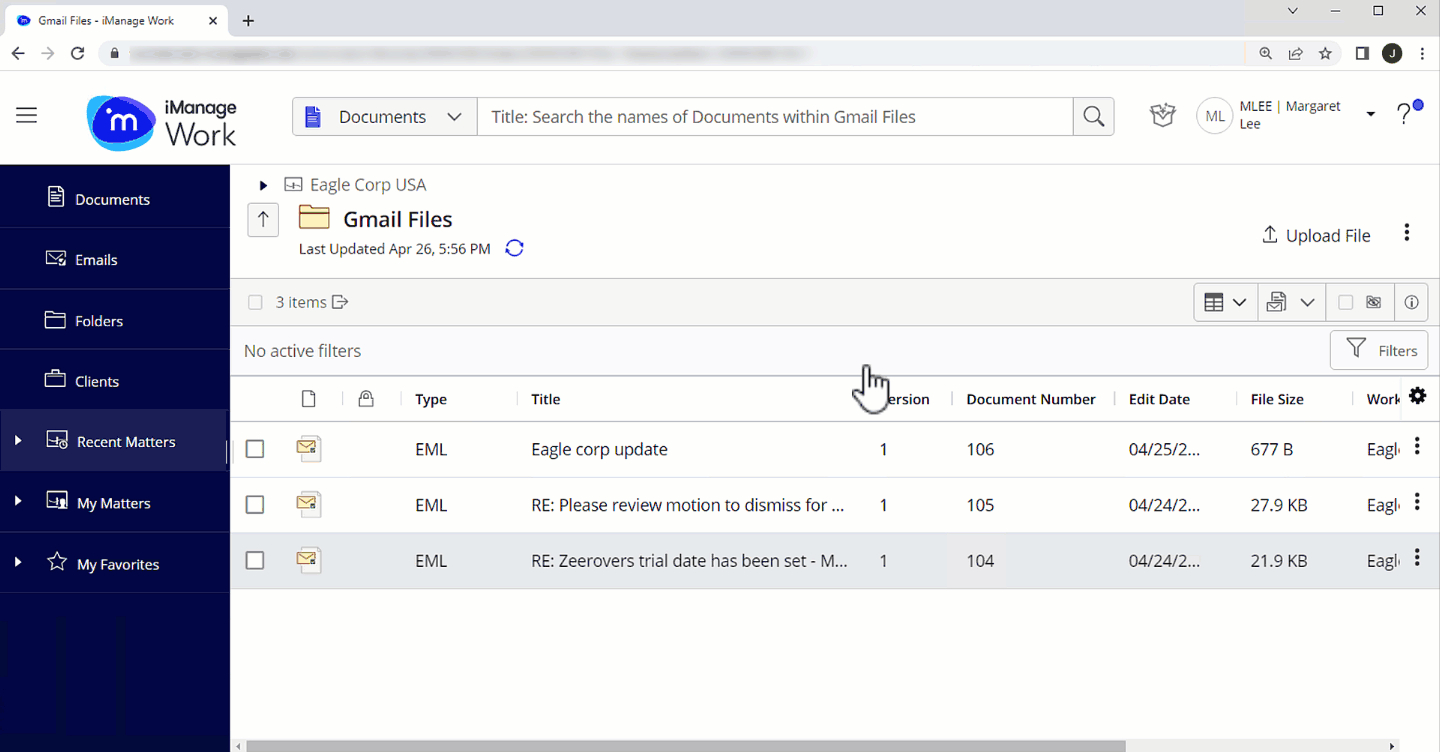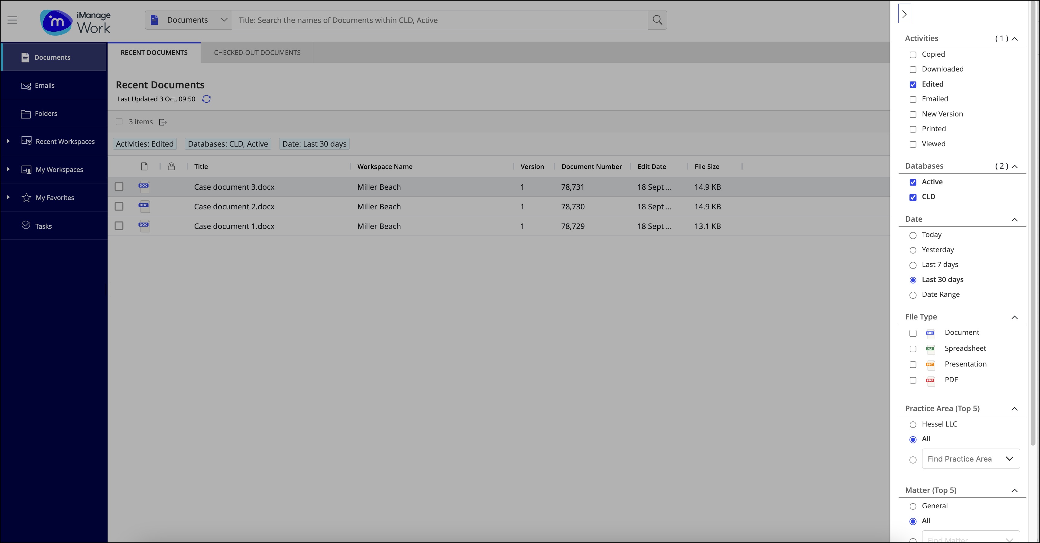 After performing a search using the Docs & Emails search type in iManage, you can now filter emails in the search results using the Email option under the File Type filter. You can also use the Email option under the File Type filter in a document folder to filter just the emails.