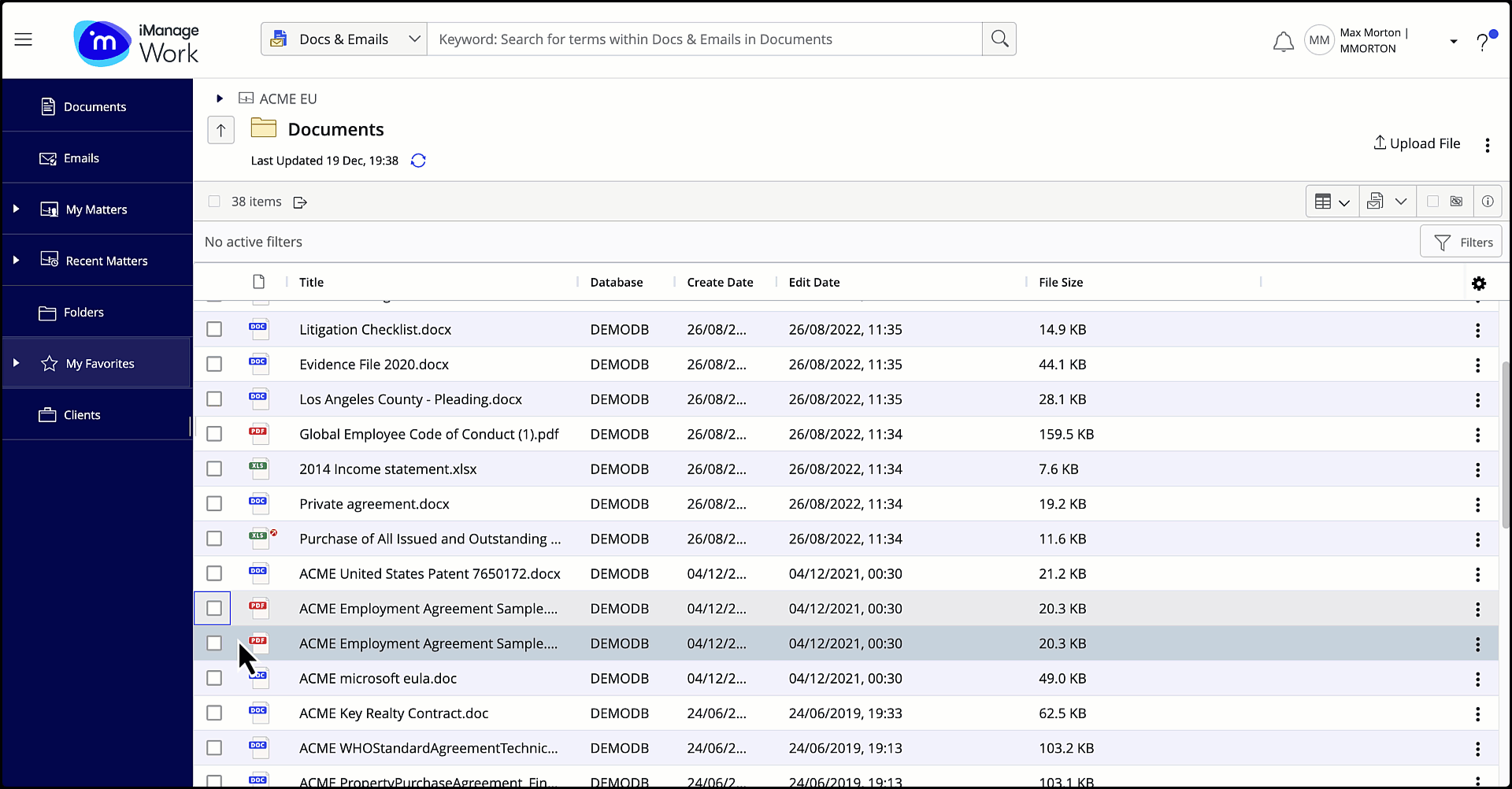 This release of iManage Work introduces the ability to select and open multiple files in their native applications. With iManage Work Desktop for Windows installed on your computer, you can select upto 50 files at once. For these files, you can perform the Open and Open read-only actions from the multi-select toolbar or, the right-click context menu. These actions are available for files in: