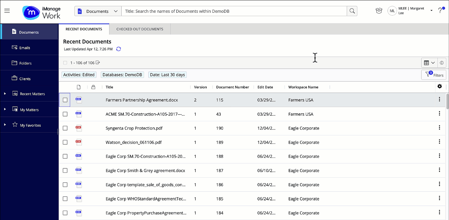 There’s now a more intuitive search experience within the lookup fields throughout the iManage Work. More relevant search results are now displayed at the top of the result set.