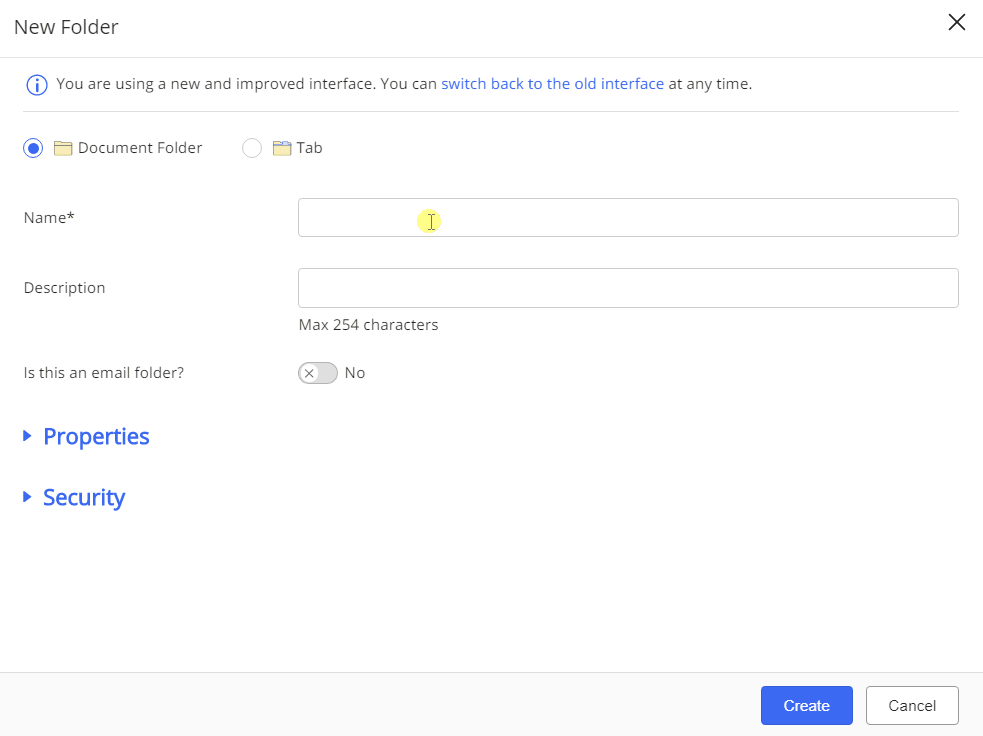 a name and description for the document folder. (Optional) Select the Is this an email folder toggle switch to the option of emailing documents to a unique address and have those documents filed in this folder. NOTE: Metadata and security are automatically inherited from the parent folder. - (Optional) To change the metadata, you can edit any of the Properties field before creating the folder. You can the Inherit from parent folder toggle switch to set access for users and groups. After disabling the toggle switch, select the Default Security drop-down list and use the search box set access permission for users and groups. are indicated by the