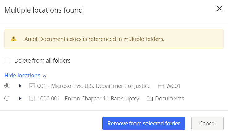 Document with multiple versions and references in multiple locations Document deletion displays a dialog box to users where they can remove the document reference from one/all folders or delete the document from all folders/delete all versions of the document. | | - Select Expand to view locations, select the preferred location from where you wish to remove the document then select Remove from selected folder.