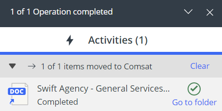 Select Go to folder in the progress dialog box to navigate to the new location of the document shortcut(s).
