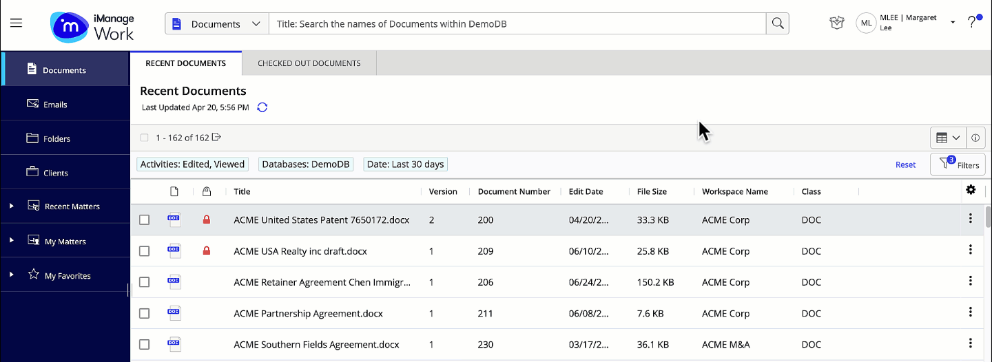 Setting the search scope to In Recent Matters returns results from your Recent Matters list, which is content that you have accessed in your matters in the past 30 days.