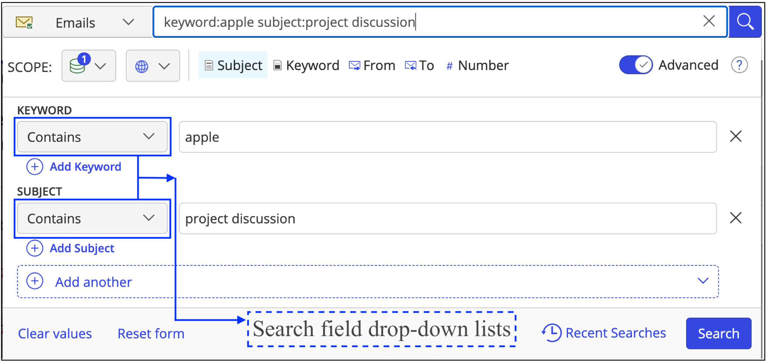 Figure: Performing advanced search for emails