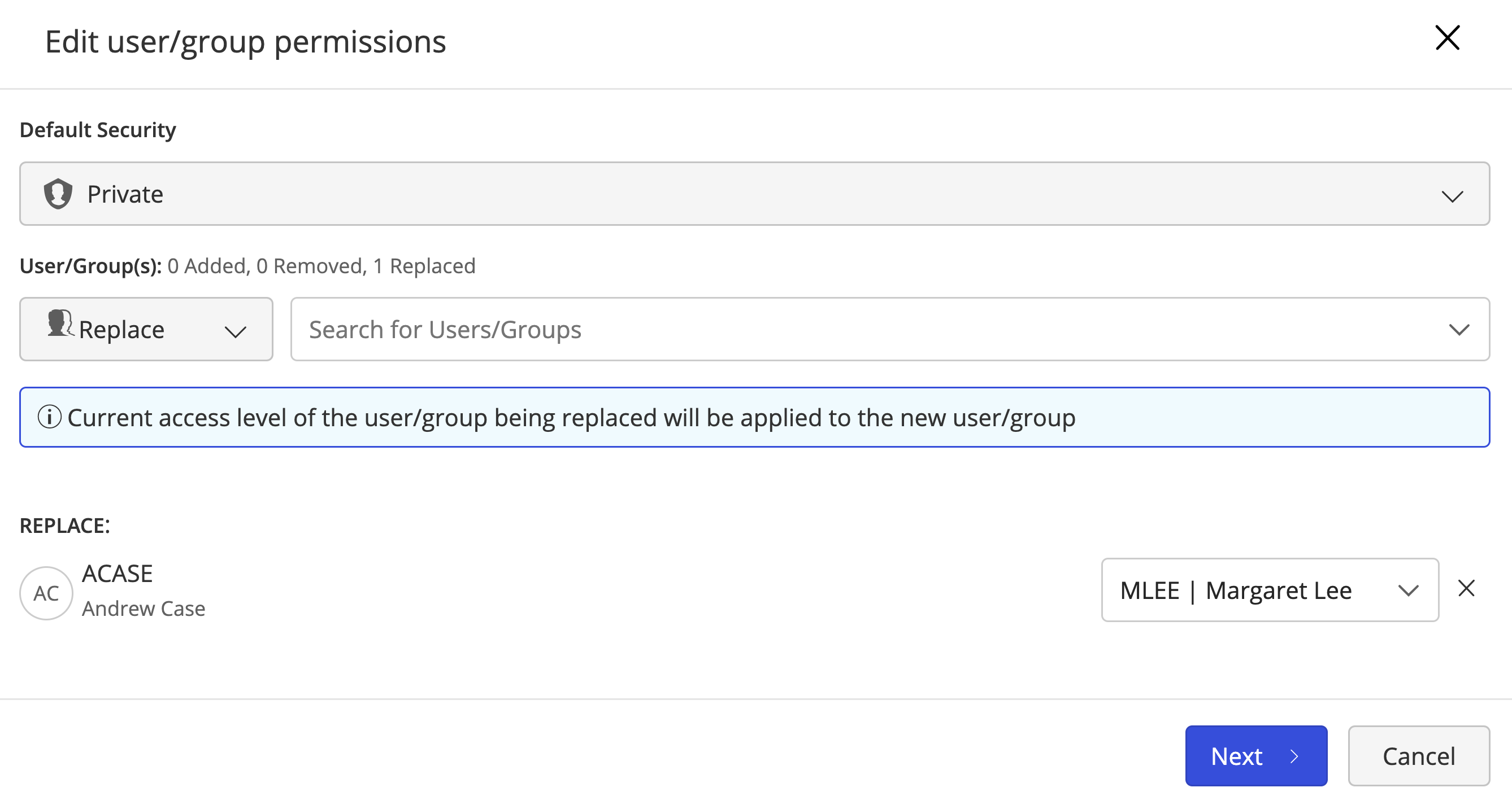 Figure: Replacing users or groupsIn the search box, type the user(s) or group(s) name to look it up and replace.